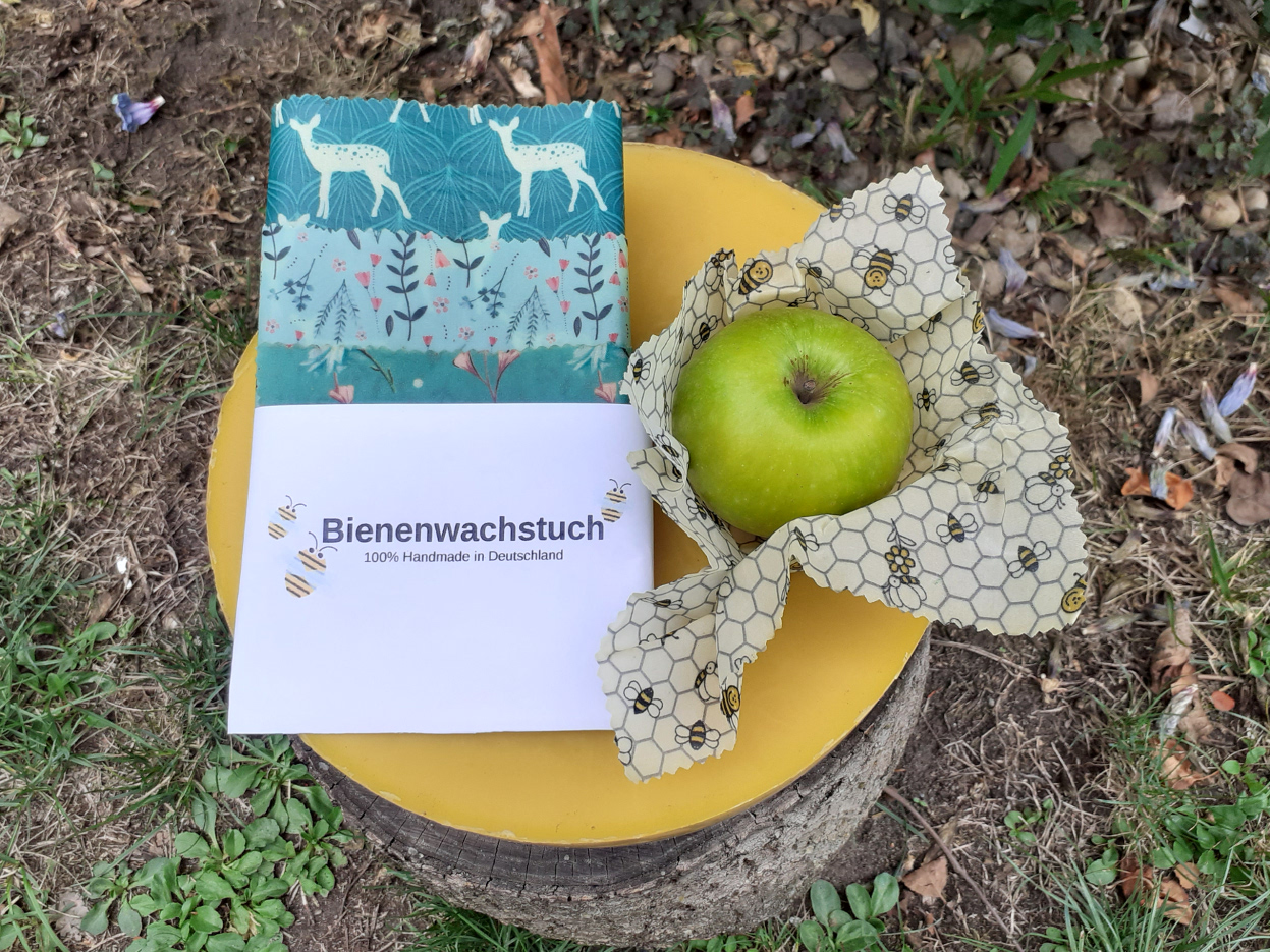 Hilf mit, die Umwelt vor zu viel Verpackungsmüll zu bewahren und benutze Mehrwegverpackungen aus Bienenwachstüchern. Unsere Bienenwachstücher bestehen aus Baumwollstoffen mit den Label Ökotex 100, aus Bienenwachs unserer Imkerei, Baumharz der Schwarzkiefer und Bio-Jojobaöl oder Bio-Kokosöl. In liebevoller Handarbeit verarbeiten wir alle Rohstoffe und stellen praktische Bienenwachstücher her.